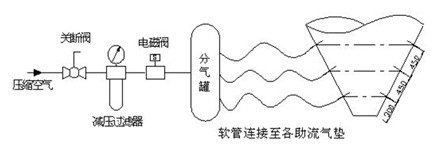 該流化器裝于物料易架橋的料倉(cāng)內(nèi)壁,通過(guò)外接的壓縮空氣分流在皮碗周?chē)?br />